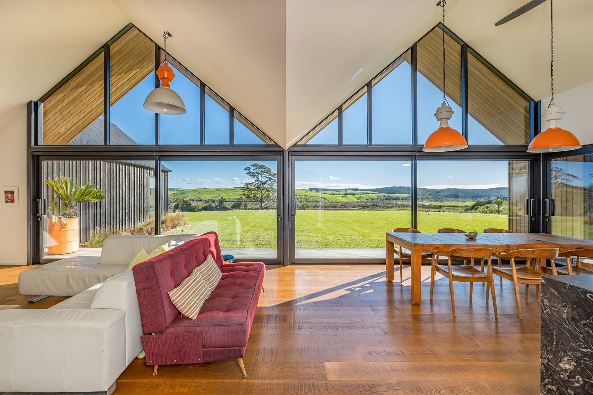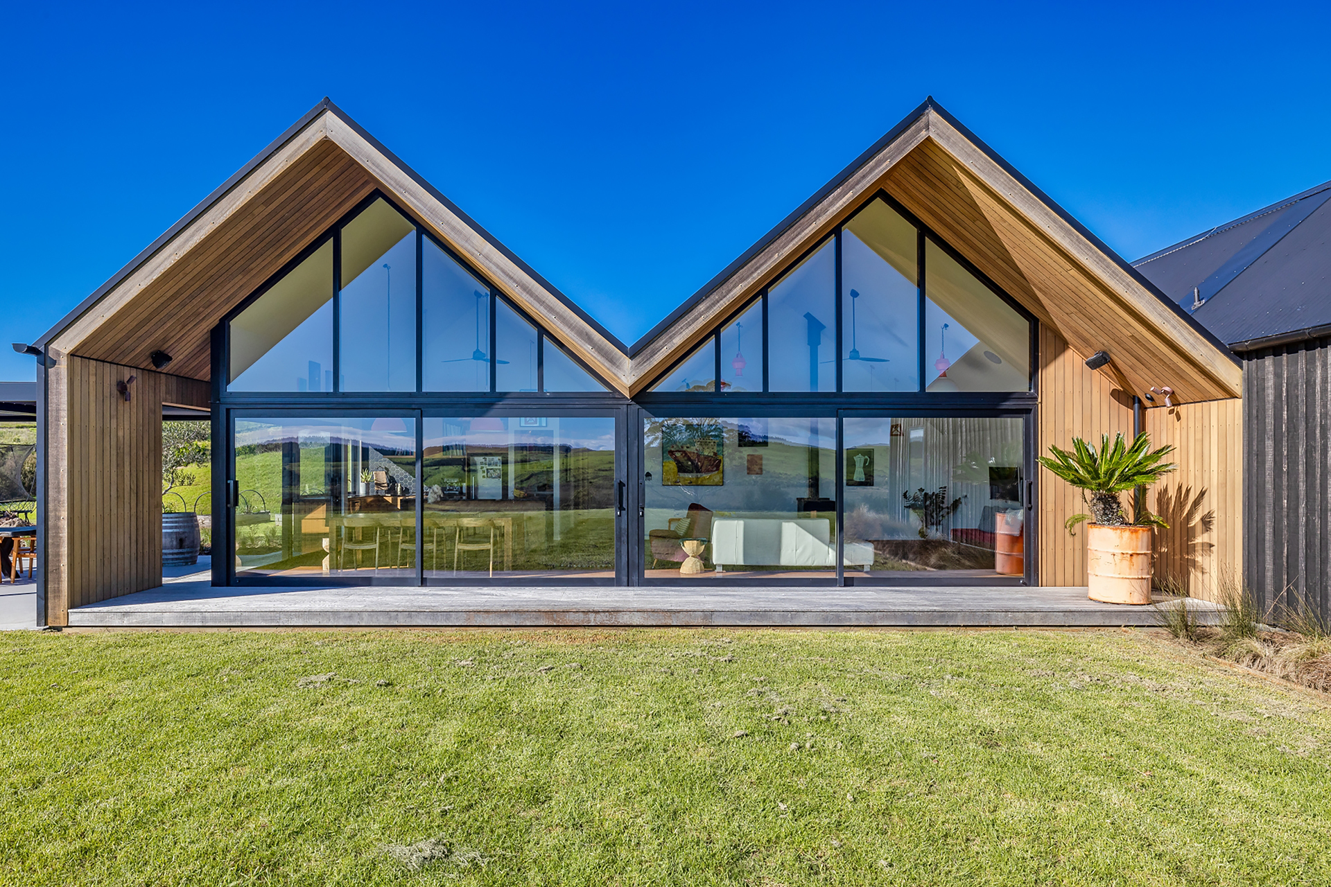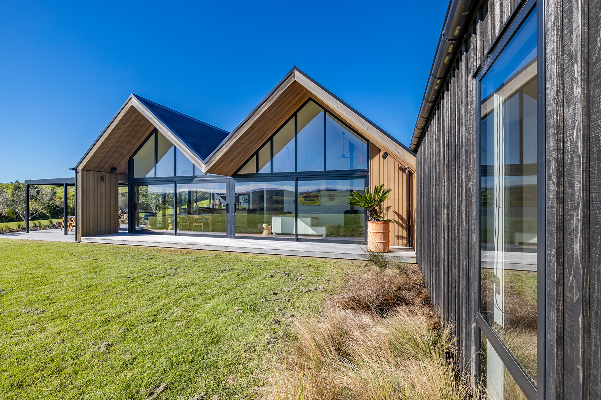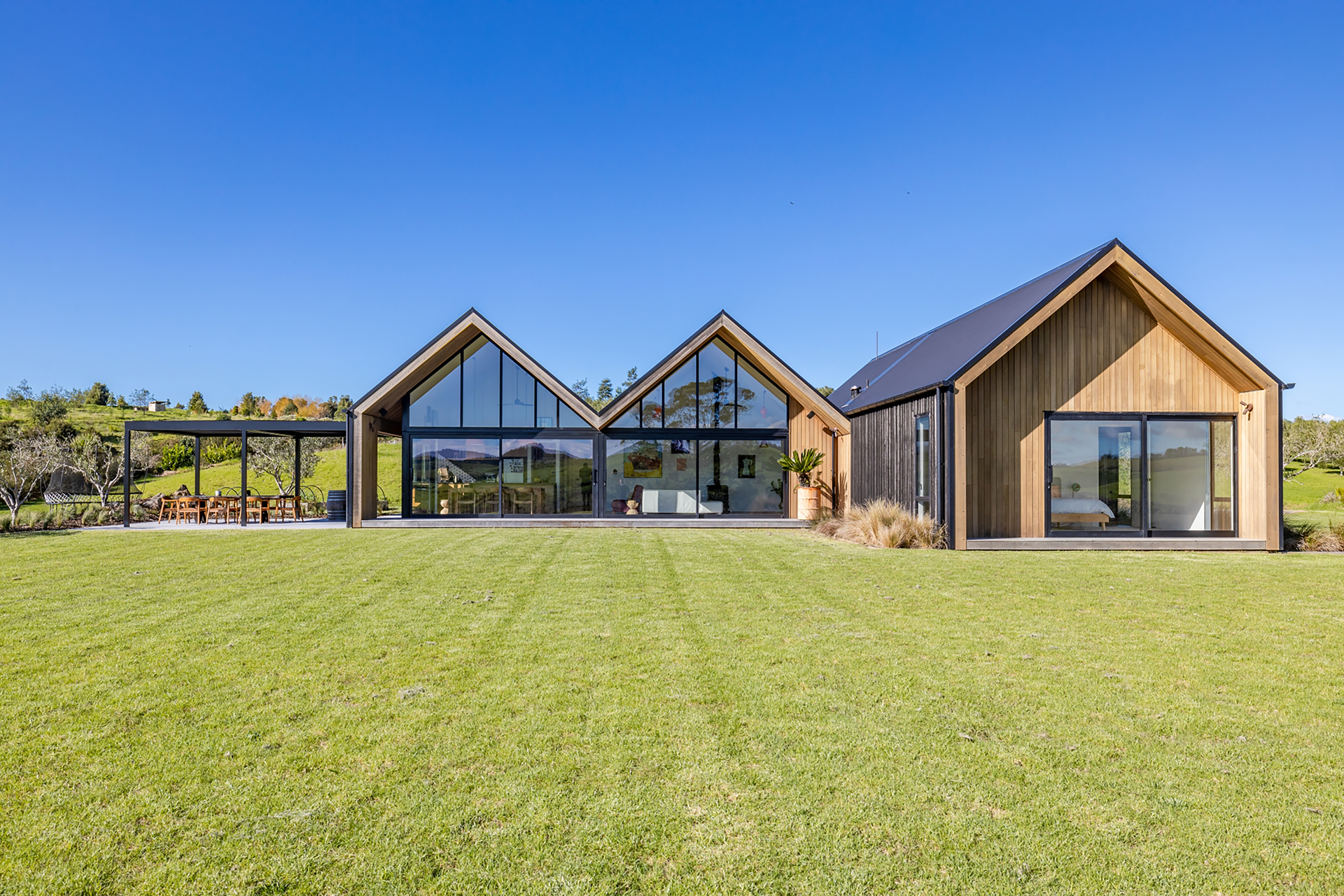 A striking new home on an olive orchard in the Bay of Islands. The owners were inspired by imagery of modern renditions of barn-like forms, particularly from some Australian examples. Exacting attention to detail, including a roof set out that repeats to millimetre perfect symmetry pays dividends in realising the dream.